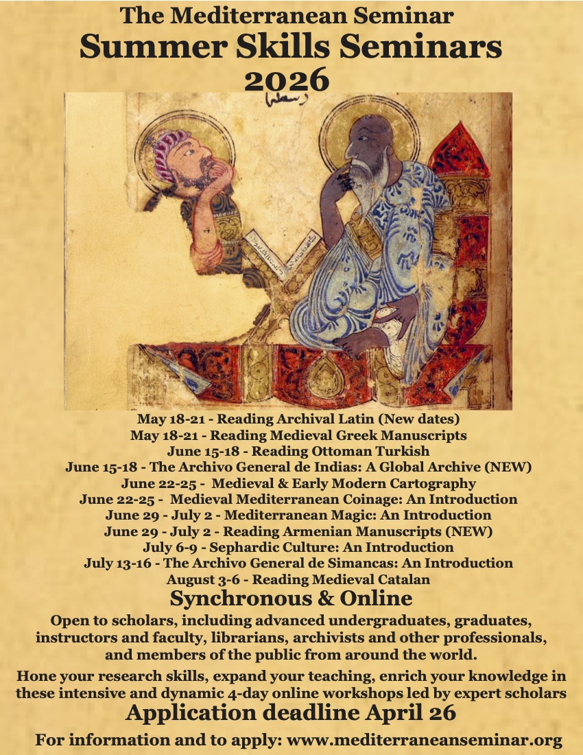 July 13-16 2026 - The Archivo General de Simancas: An Introduction<https://urldefense.com/v3/__https://mediterraneanseminar.squarespace.com/welcome-archivo-general-de-simancas-2026__;!!C5qS4YX3!Ehk8kRRbcG1gqI2M1LSyUAt0X_PXKBXeOfp89HwnR3BnVHBBSA_DdHDdagtlMVOx0BYkZKco2SQKxRjqVDJ-1C70RoM$>