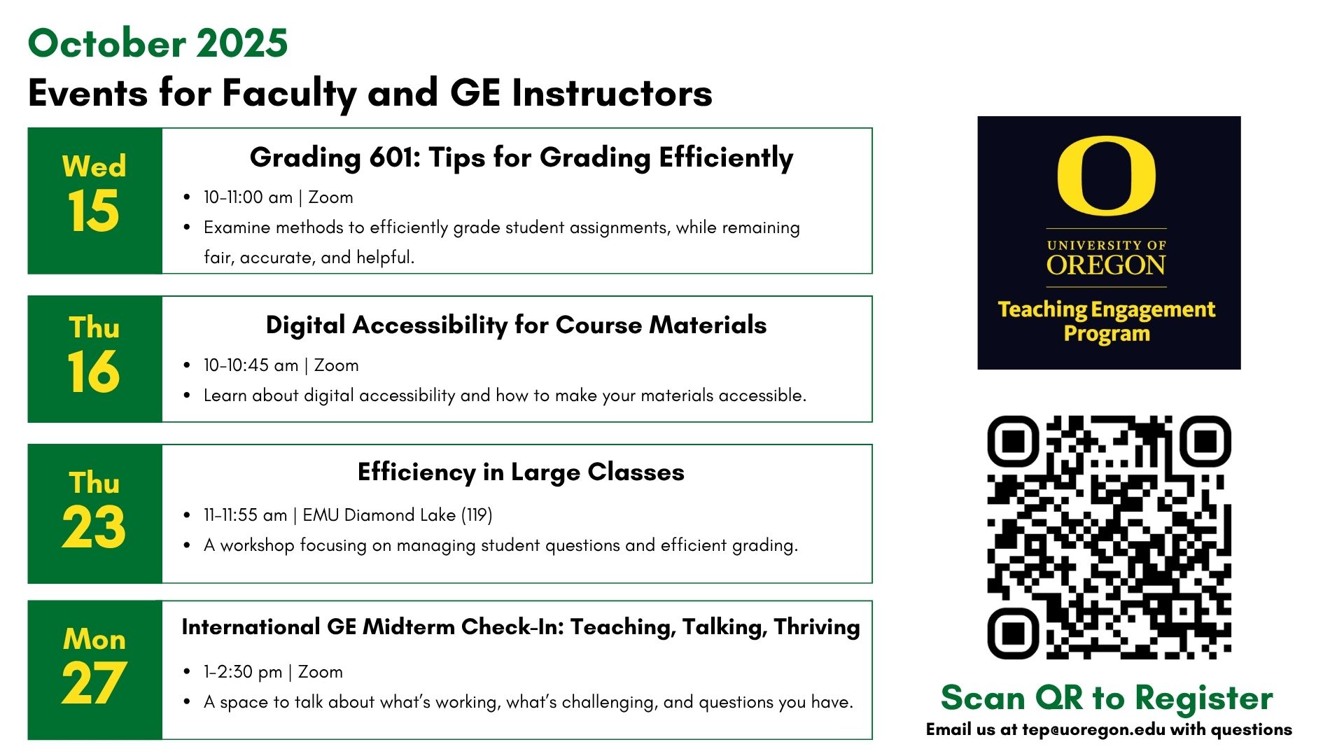 15 October | Grading 601: Tips for Grading Efficiently<https://teaching.uoregon.edu/events/grading-601-tips-grading-efficiently-0>