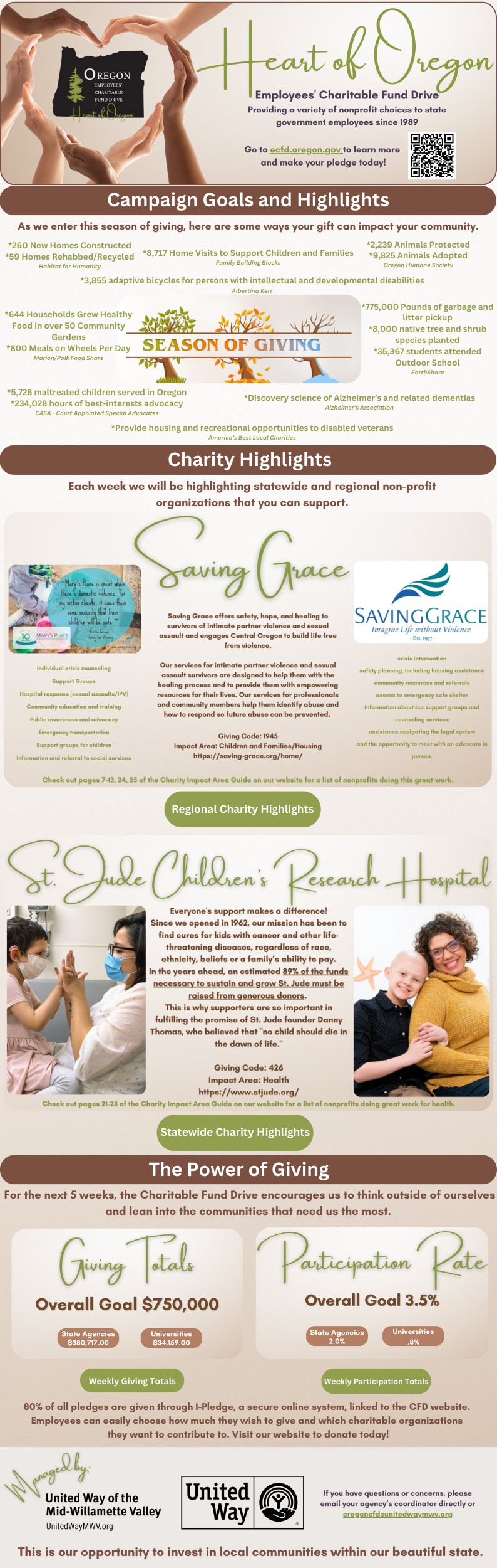 The Charitable Fund Drive is an annual, combined charitable giving campaign tailored to meet the needs and wishes of employees of the state of Oregon. The Charitable Fund Drive helps state employees create the future each of you wants to see become a reality in Oregon. Whether you care about Oregon's animals, arts and culture, environment, equity and human rights, health, housing, families, or anything else - there is a nonprofit working for these ideals. Donations can be made starting now through December 27, 2023.