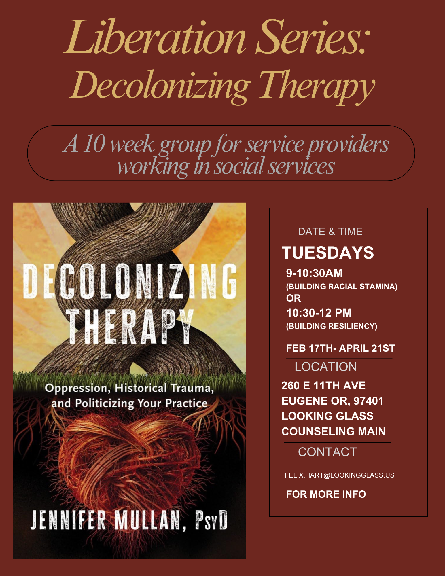 The Liberation Series is a series of groups for providers in the community that will focus on conversations and working with material connecting us to the root of the healing work we do. This round will be processing the book Decolonizing Therapy by Dr. Jennifer Mullan over 10 weeks. This is a space for therapists, social service providers and any staff that interact with clients; we're all part of the therapeutic process.
