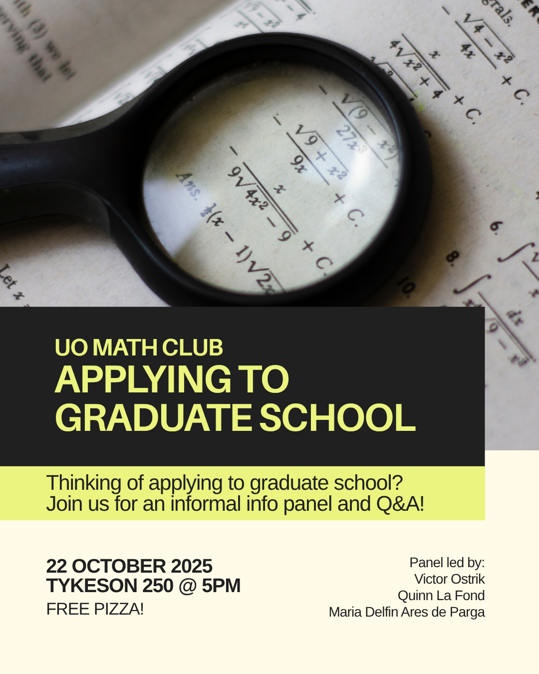 We will have our second math club meeting this Wedneday, October 22nd, at 5pm, in Tykeson 260. We will be hosting an informal Grad School panel where you can learn more about application requirements, receive advice/suggestions on applying, and ask any questions you may have. As always, there will be pizza. We hope to see you there!