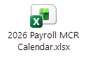 Manual Check Requests (MCR). The 2026 payroll MCR calendar is attached for reference. MCR processing is 3 days per week, excluding termination payouts.