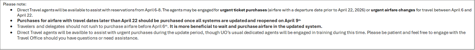 [Please note: * Direct Travel agents will be available to assist with reservations from April 6-8. The agents may be engaged for urgent ticket purchases (airfare with a departure date prior to April 22, 2026) or urgent airfare changes for travel between April 6 and April 22. * Purchases for airfare with travel dates later than April 22 should be purchased once all systems are updated and reopened on April 9th * Travelers and delegates should not rush to purchase airfare before April 6th. It is more beneficial to wait and purchase airfare in the updated system. * Direct Travel agents will be availble to assist with urgent purchases during the update period, though UO's usual dedicated agents will be engaged in training during this time. Please be patient and feel free to engage with the Travel Office should you have questions or need assistance.]