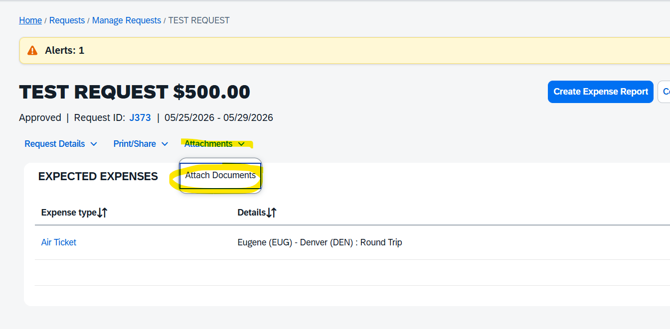The travel agent needs authorization to use the UO Lodge Card to purchase the airfare. A copy of the approved Concur Request provides this authorization. Once the Request has been completely approved, a PDF copy will need to be sent to the travel agent. Follow the process below: