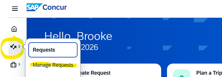 Log into Concur and go to Request/Manage Requests [cid:image001.png at 01DCC060.00CDC130]