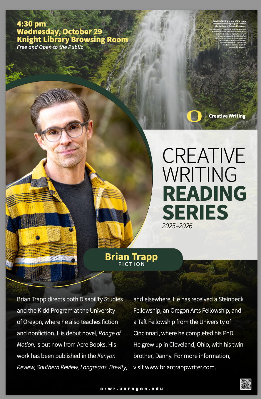 Disability Studies director Brian Trapp will be reading from his debut novel, Range of Motion<https://urldefense.com/v3/__https://www.amazon.com/Range-Motion-Novel-Brian-Trapp/dp/1946724963__;!!C5qS4YX3!DWVGrmY_Z0eUmnyXBEF9ZV6Wf6mcG7i4mfGRlqIw5C222j9Hy6myxcMv10p1q-rN7eJBfnQ_GW-8KDE$>, at the Knight Library on October 29th at 4:30 p.m.<https://humanities.uoregon.edu/creative-writing/reading-series> Range of Motion is an often funny coming-of-age novel about twins, one of whom has cerebral palsy and intellectual disabilities. It’s partly based on growing up with his twin brother, Danny. It’s about the secret language of siblings and the resilience of special needs families. This event is free and open to the public.
