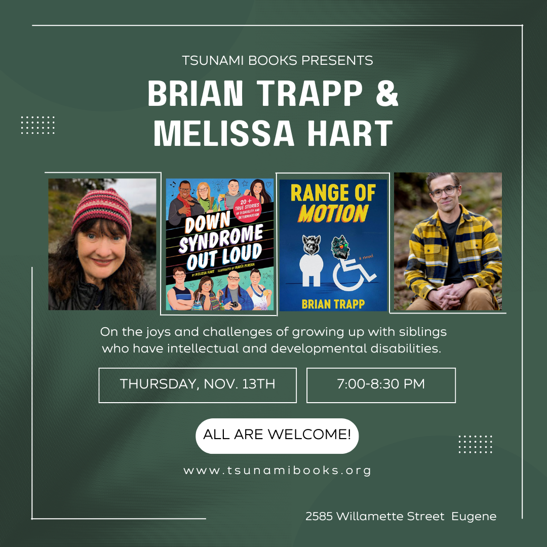 On Thursday, November 13, 7 PM at Tsunami Books, we have two “sib” authors talking about their work. I’ll be discussing Range of Motion<https://www.amazon.com/Range-Motion-Novel-Brian-Trapp/dp/1946724963>, my debut novel partly based on growing up with my twin brother, who had cerebral palsy and intellectual disabilities. And Melissa Hart will be talking about Down Syndrome Out Loud<https://www.amazon.com/Down-Syndrome-Out-Loud-Determination/dp/146421669X>, her book profiling awesome people with Down Syndrome, and sharing about life with her brother.