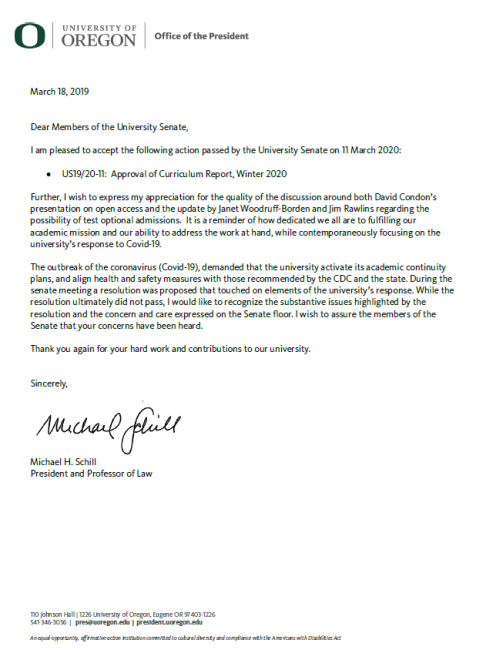 Attached is a letter from President Schill in response to UO Senate motion US19/20-11.