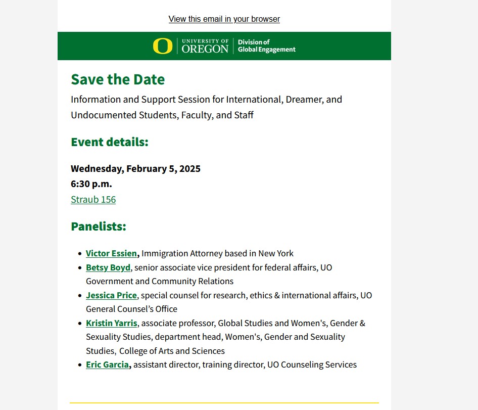 Senate leadership wants to bring your attention to an important event happening after our next Senate meeting. See below. This forum provides an excellent opportunity to deepen our understanding of immigration policies and resources, complementing discussions at our upcoming meeting. Senate President Alison Schmitke is planning on attending. Please email Alison (schmitke at uoregon.edu<mailto:schmitke at uoregon.edu>) if you want to meet prior to the event to sit together.